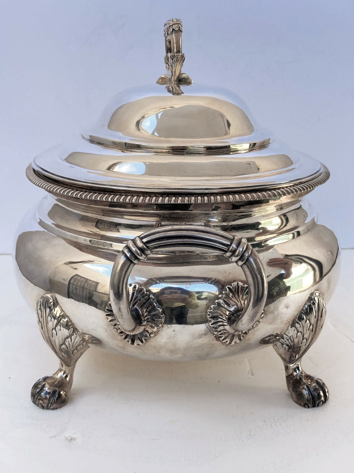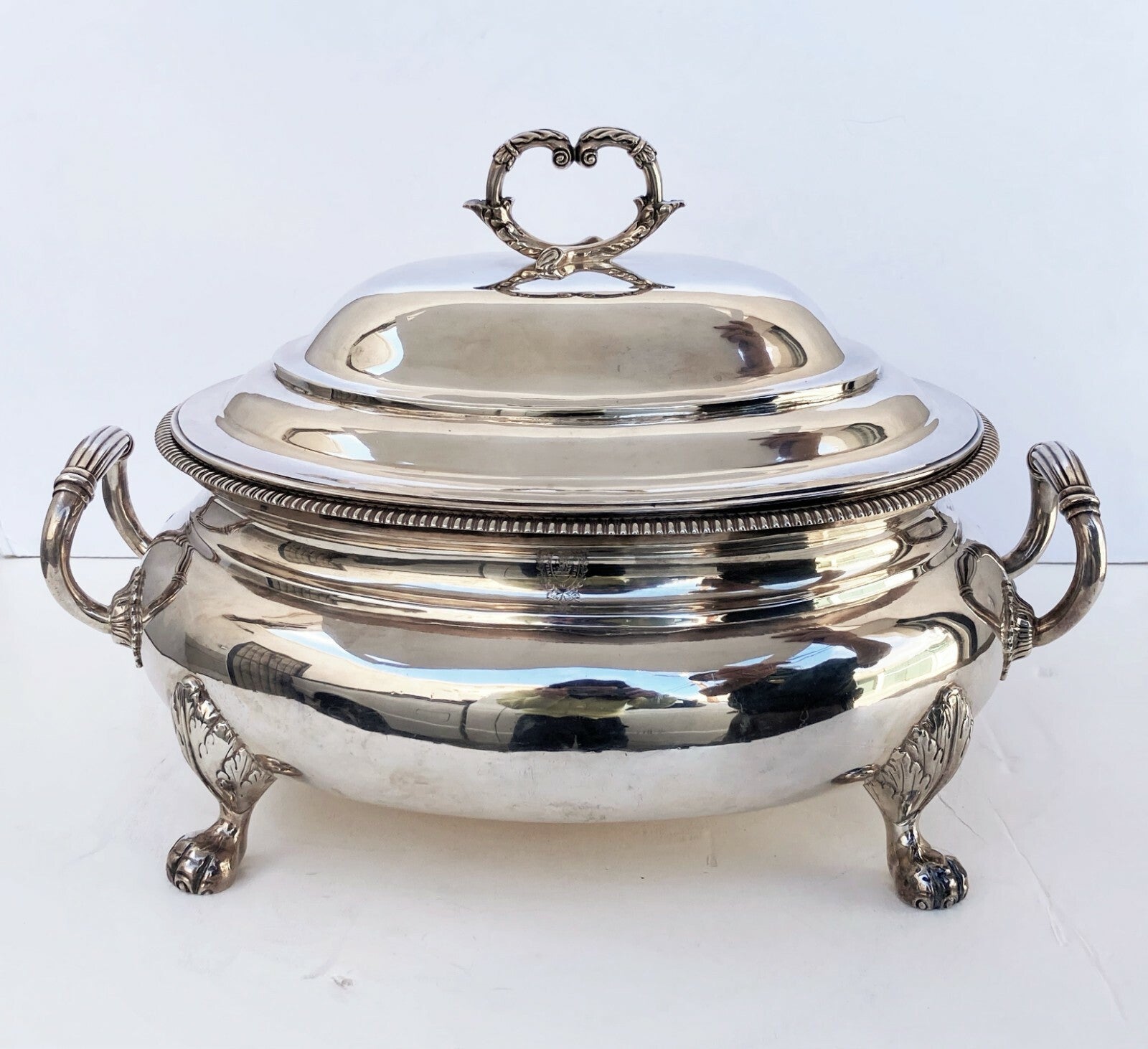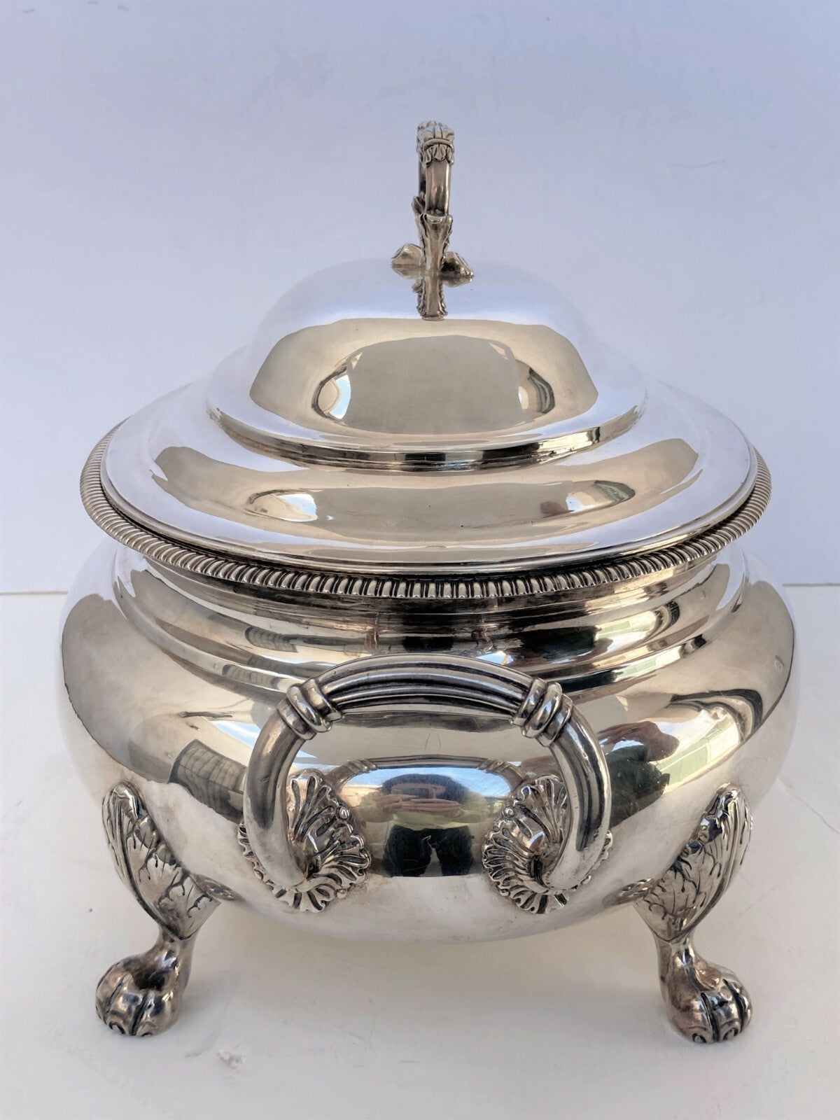 This soup tureen stands on four acanthus shaped paw feet and has upturned reeded handles.