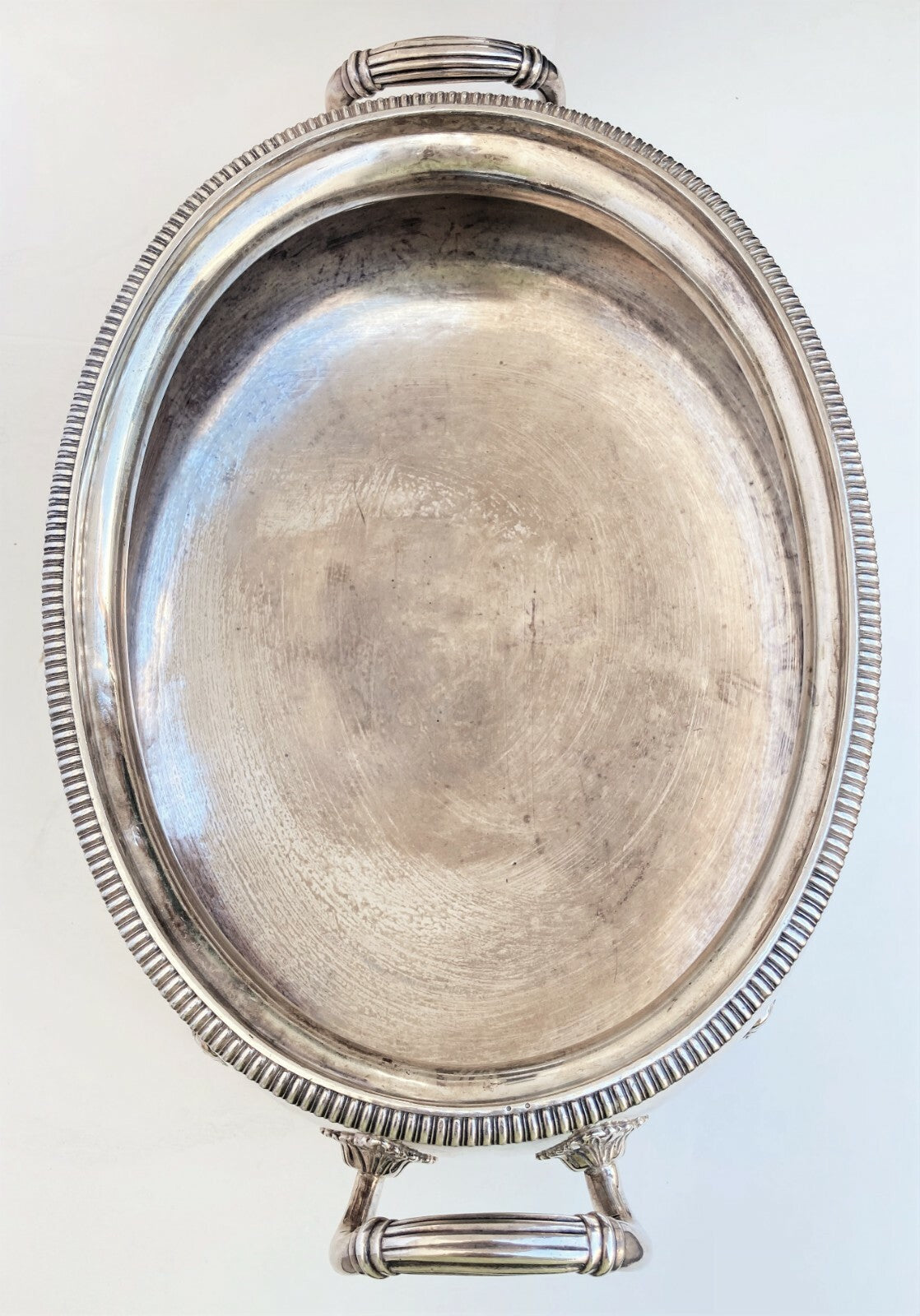 It has a lovely gadrooned rim, which holds the stepped-oval lid with an interesting fixed branch handle.