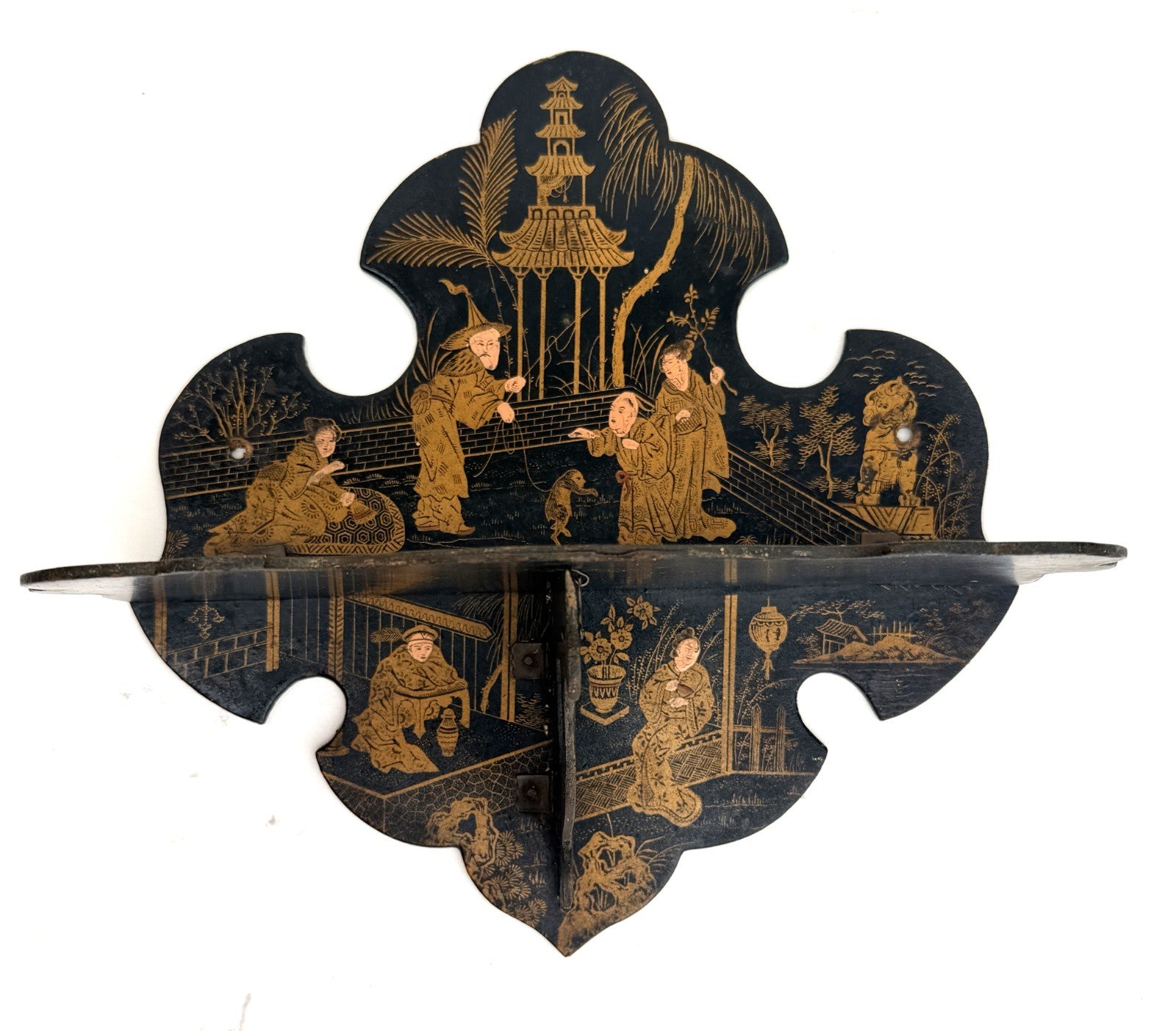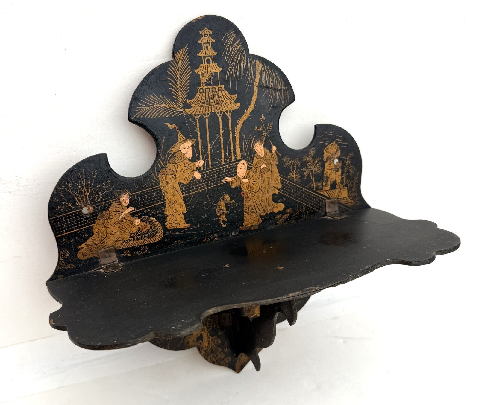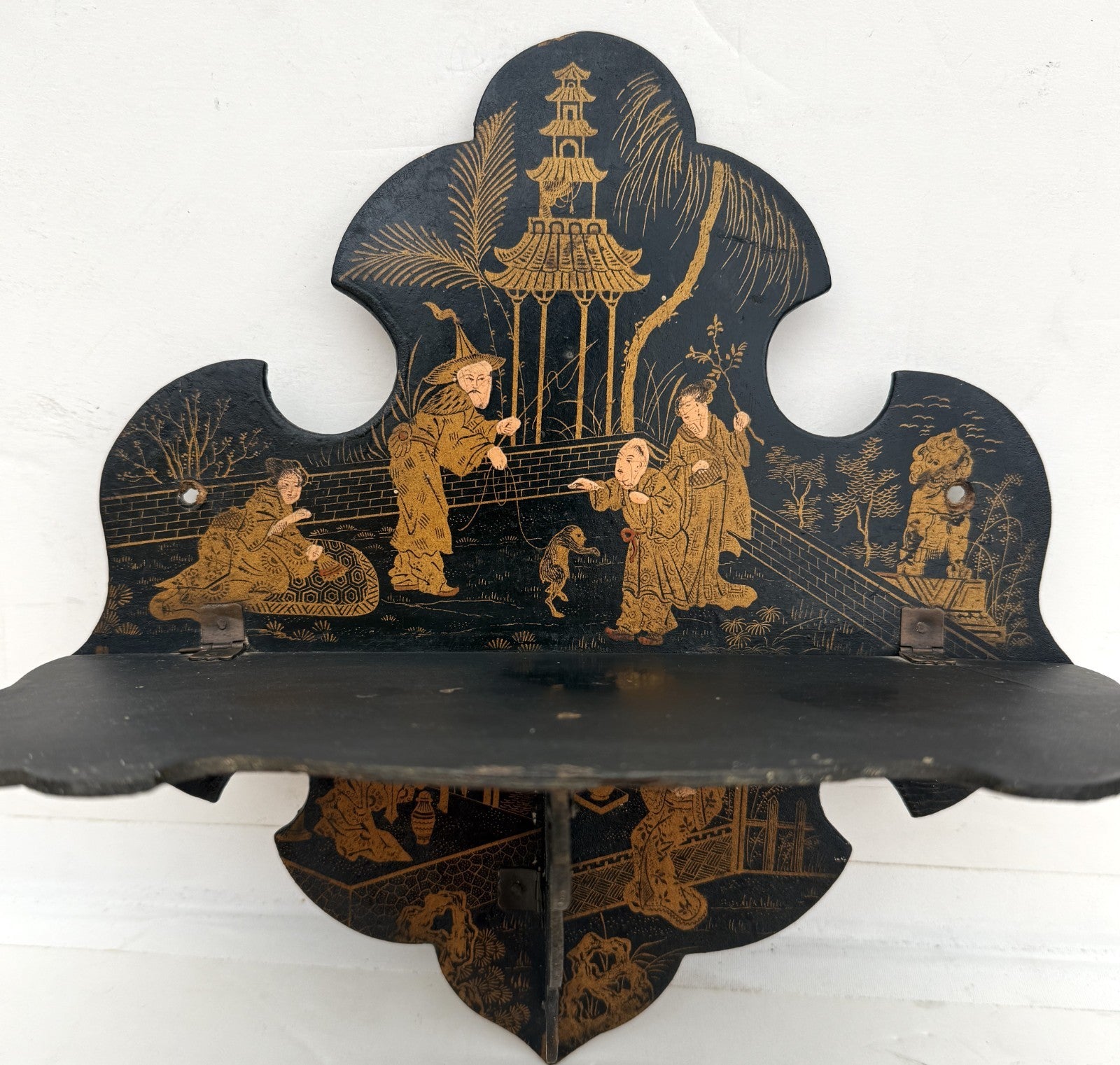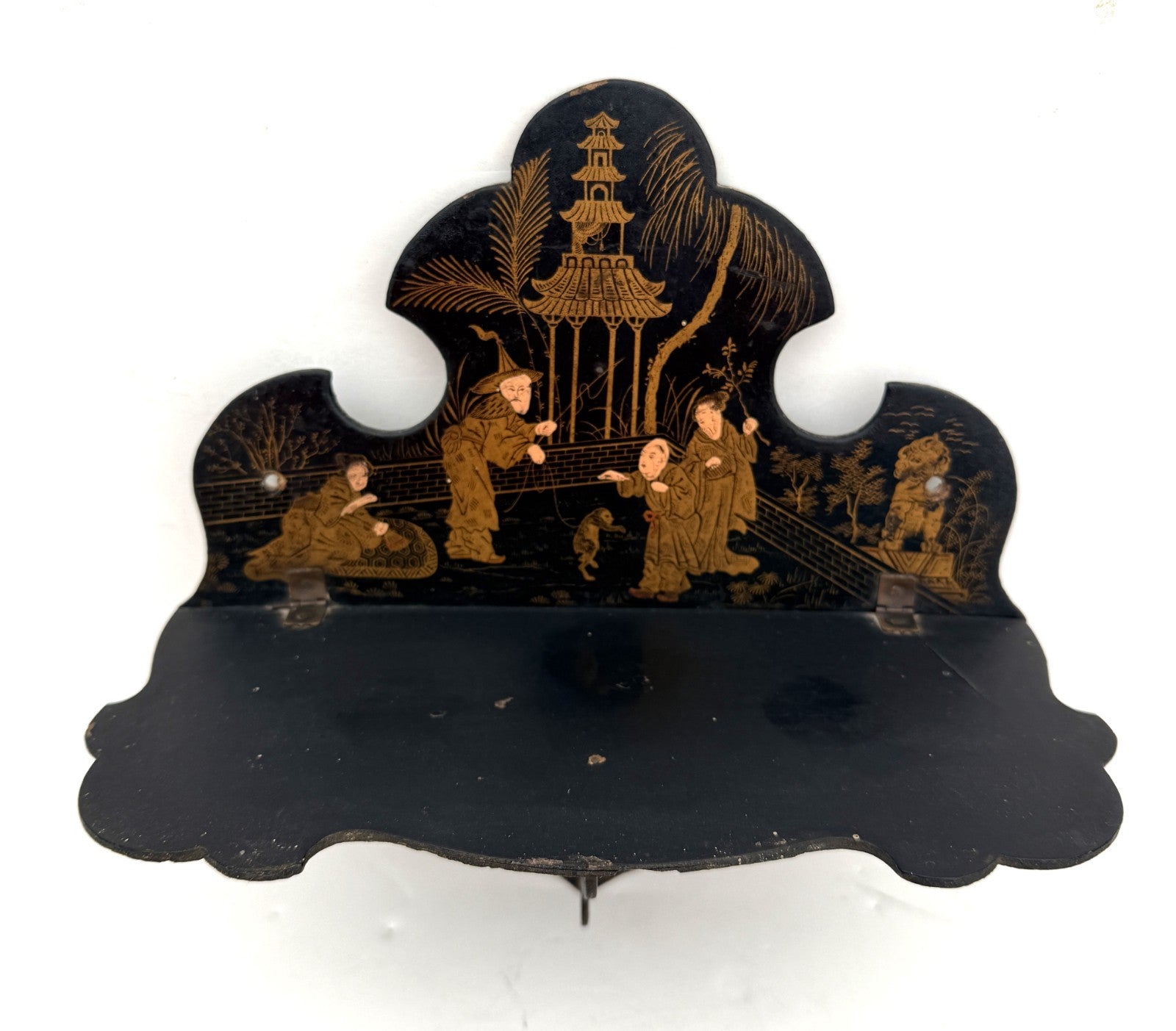 19th C. Japanese Chinoiserie Black & Gold Lacquerware Folding Wall Shelf