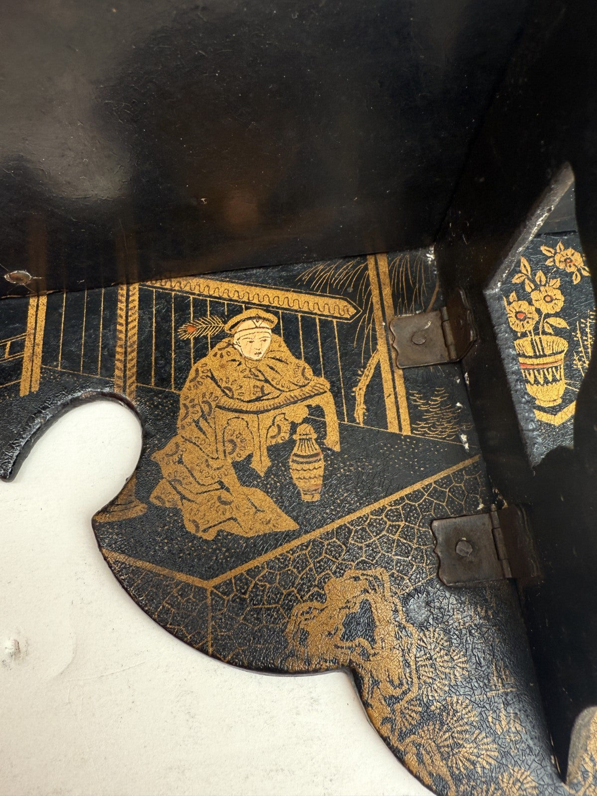 Condition: Very good age-related condition with some minor rubbing to the wood edges and the screw holes.. Minor losses to some of the gold decoration and lacquer. The old original hinges are in good working