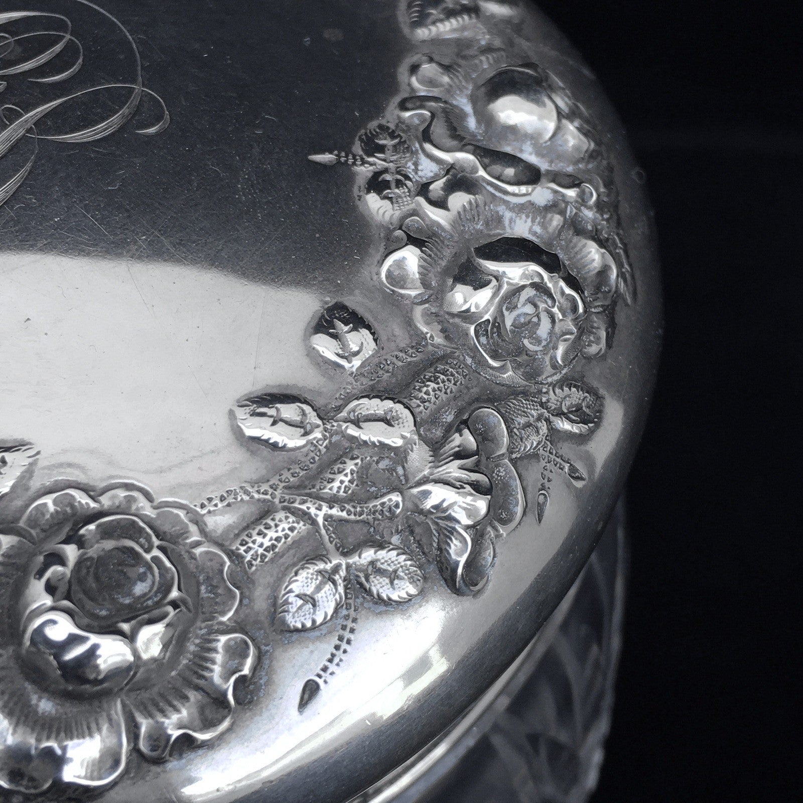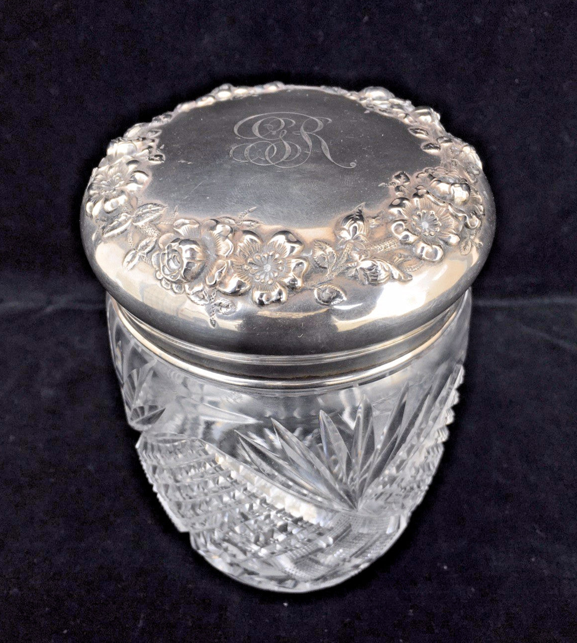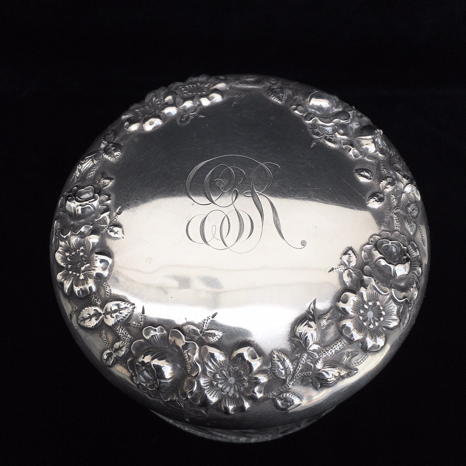 The monogramed Silver lid has a beautiful floral Repousse designed border.