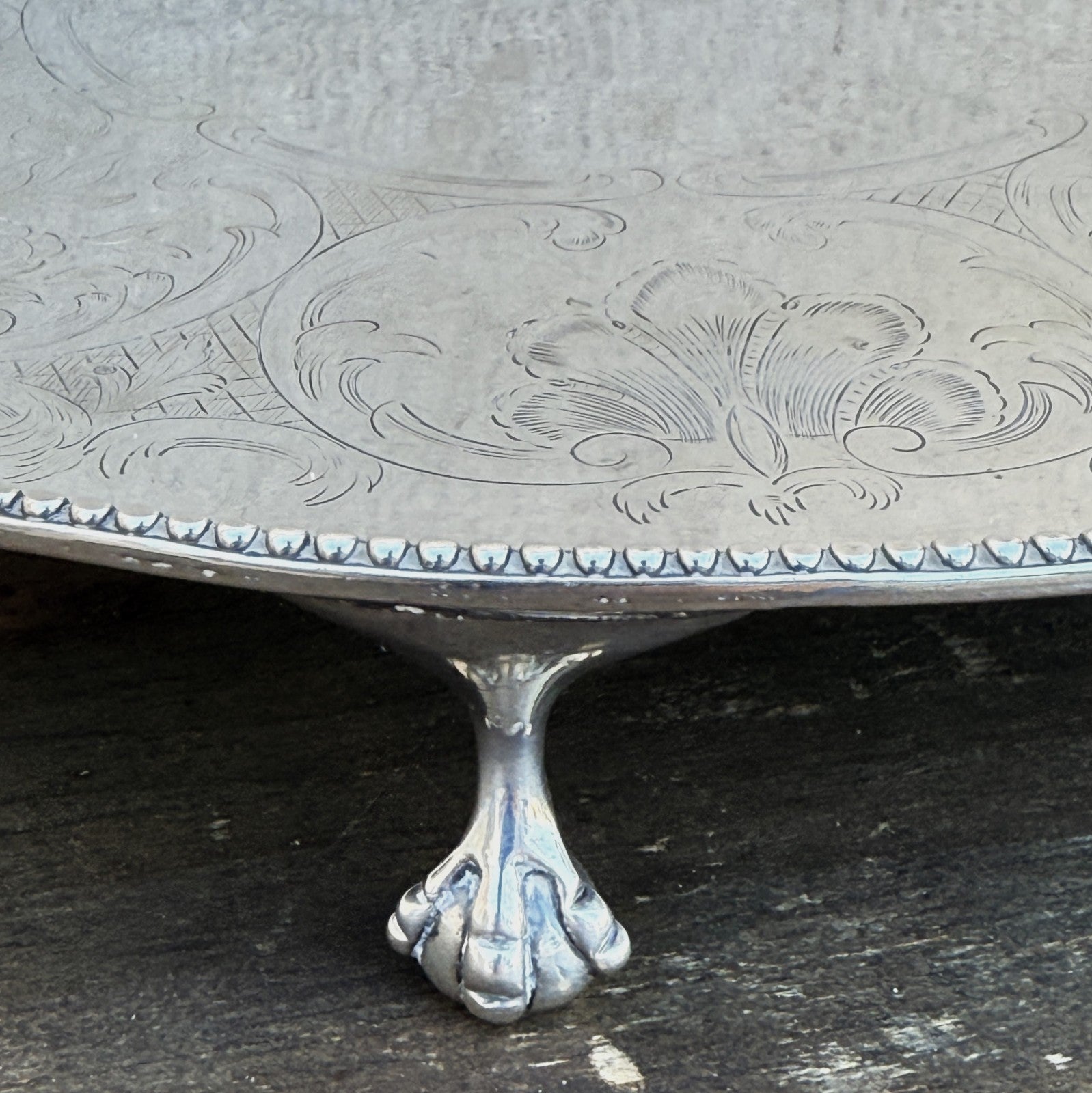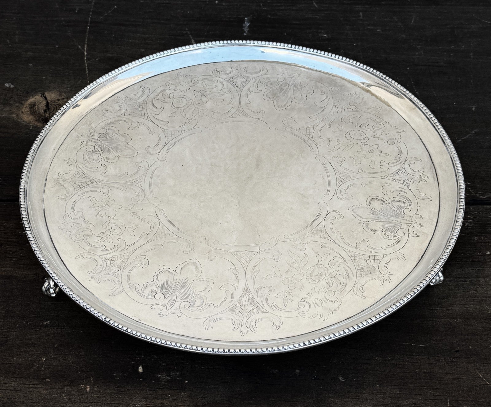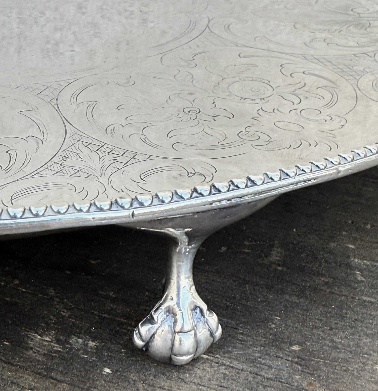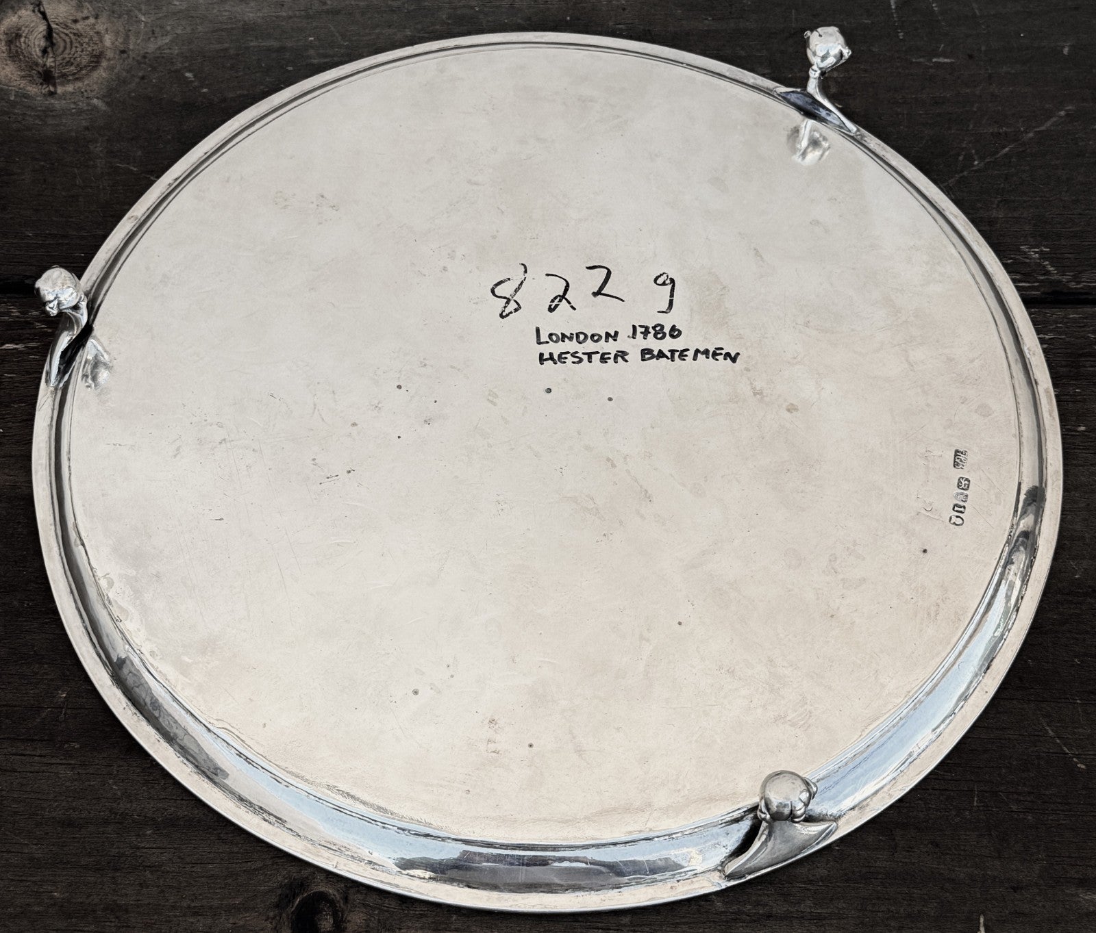 This is 822g worth of Sterling Silver. This has London Hallmarks for 1786 and "HB" for Hester Bateman. This is a circular claw footed salver, not oval. The pictures were shot a a slight angle to show the feet.