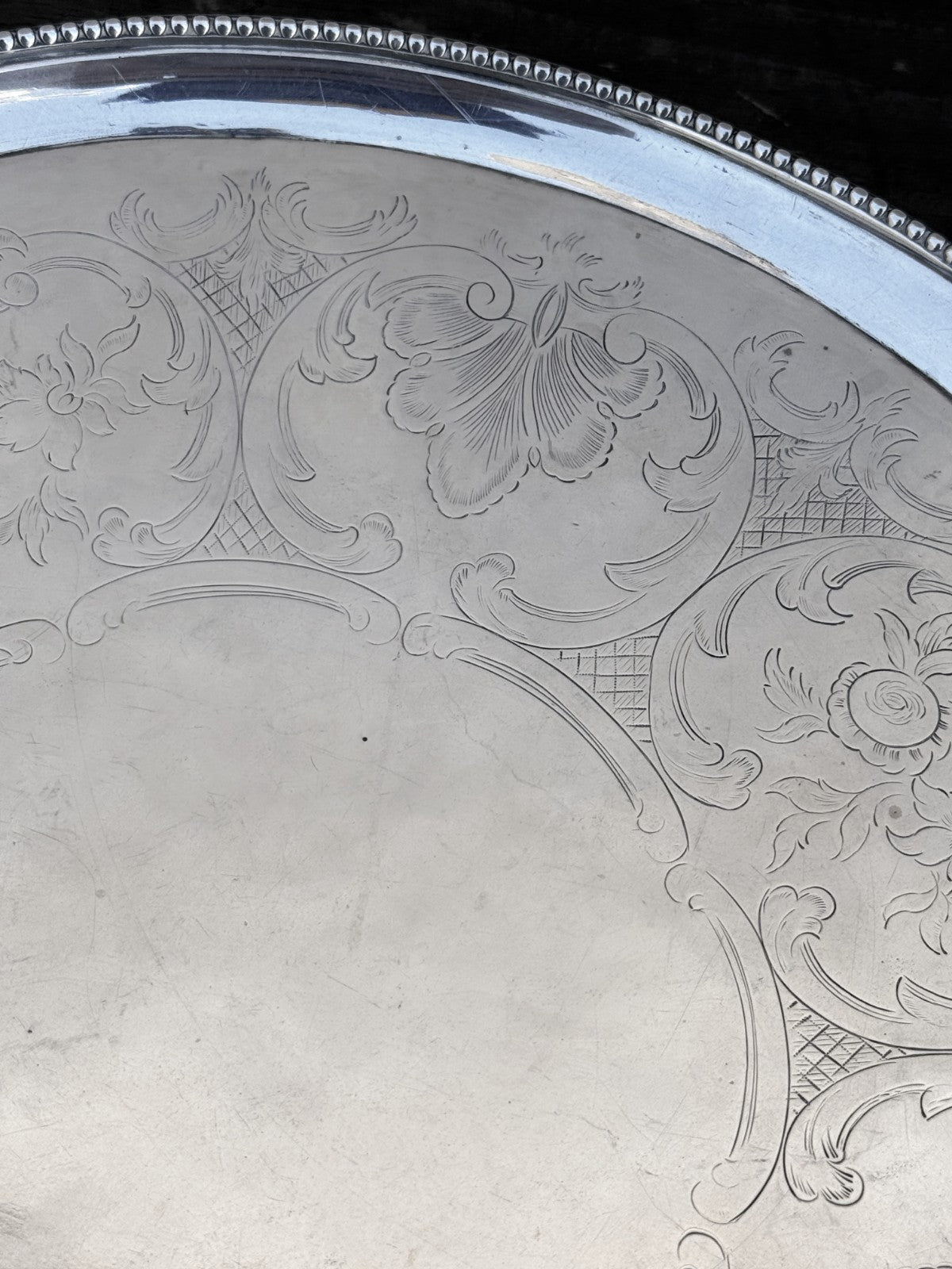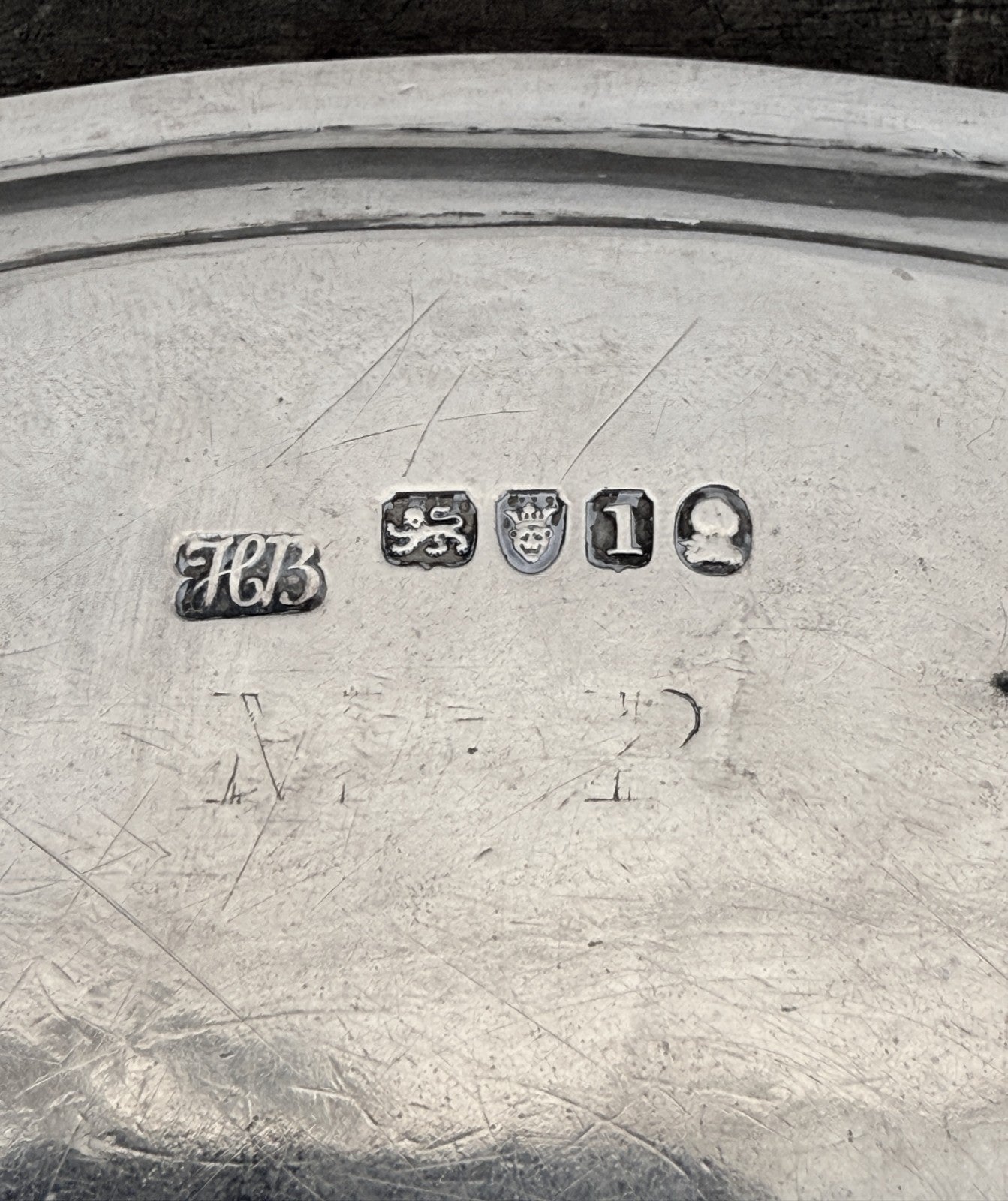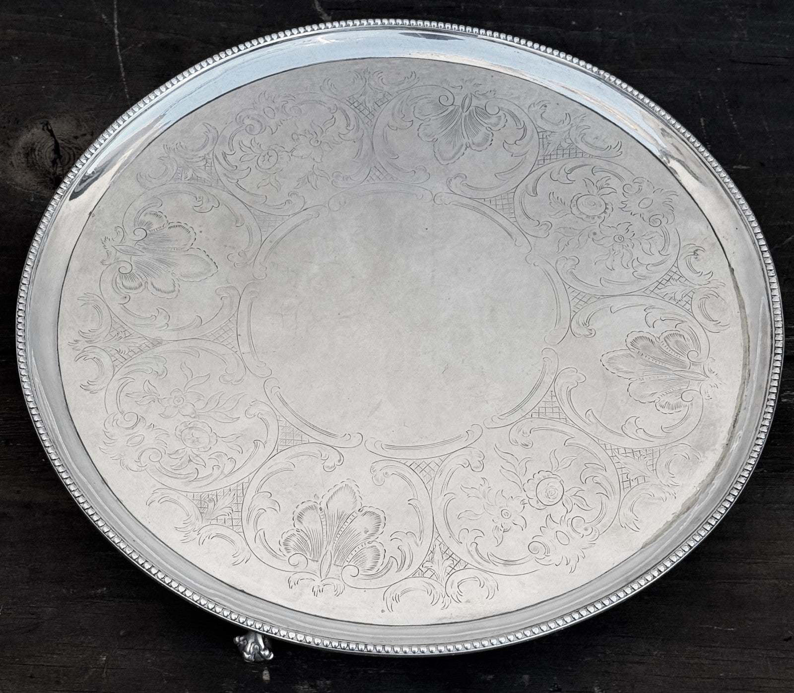 This is 822g worth of Sterling Silver. This has London Hallmarks for 1786 and "HB" for Hester Bateman. This is a circular claw footed salver, not oval. The pictures were shot a a slight angle to show the feet.