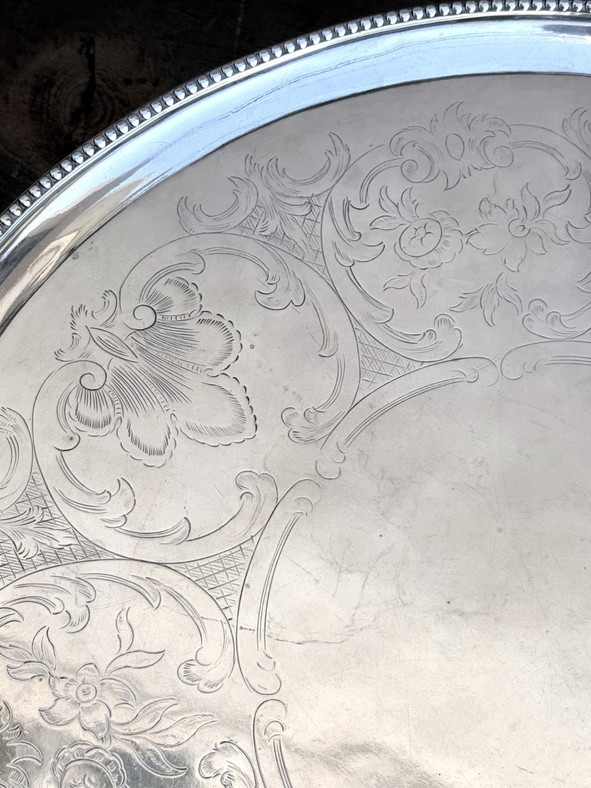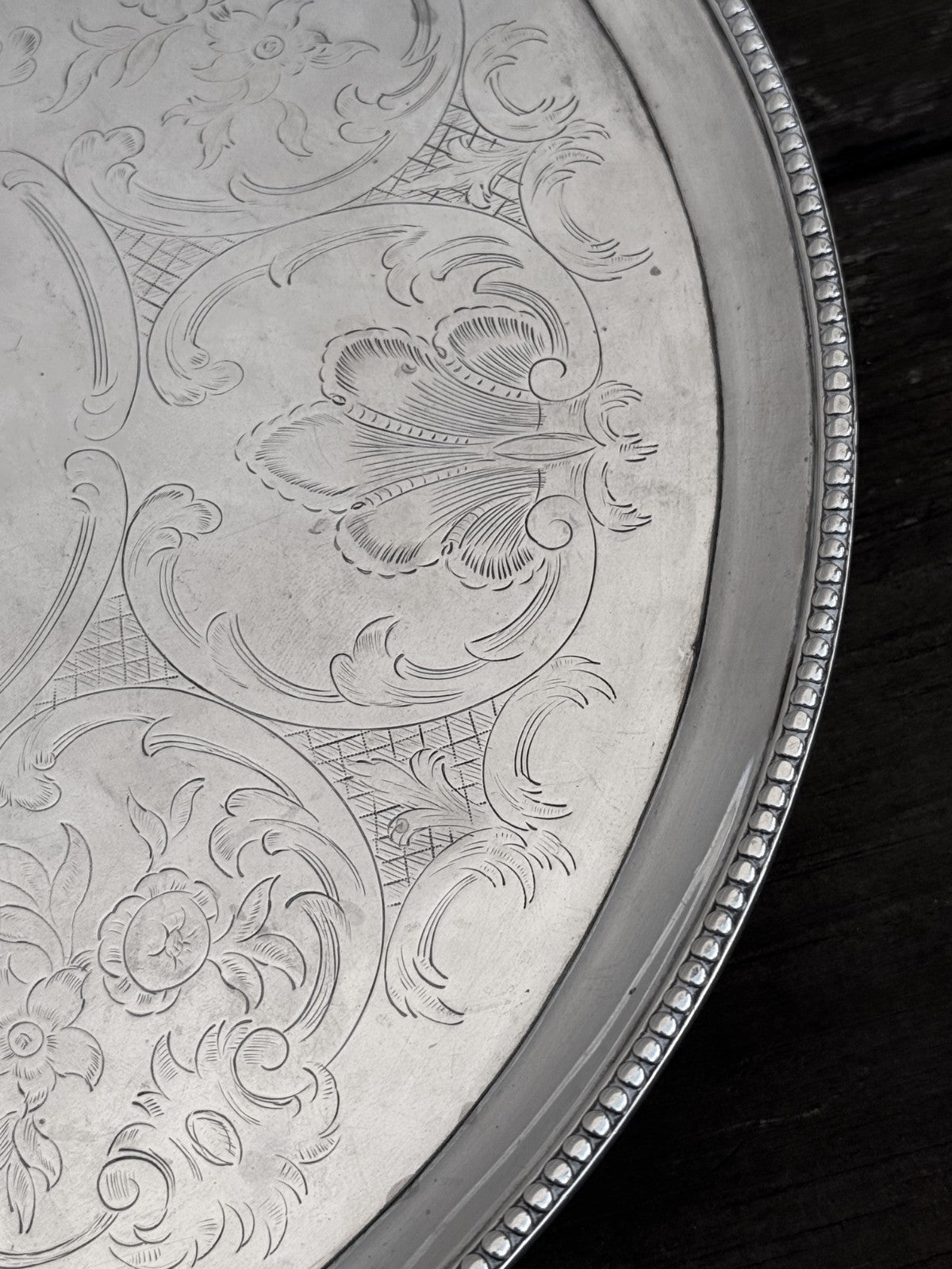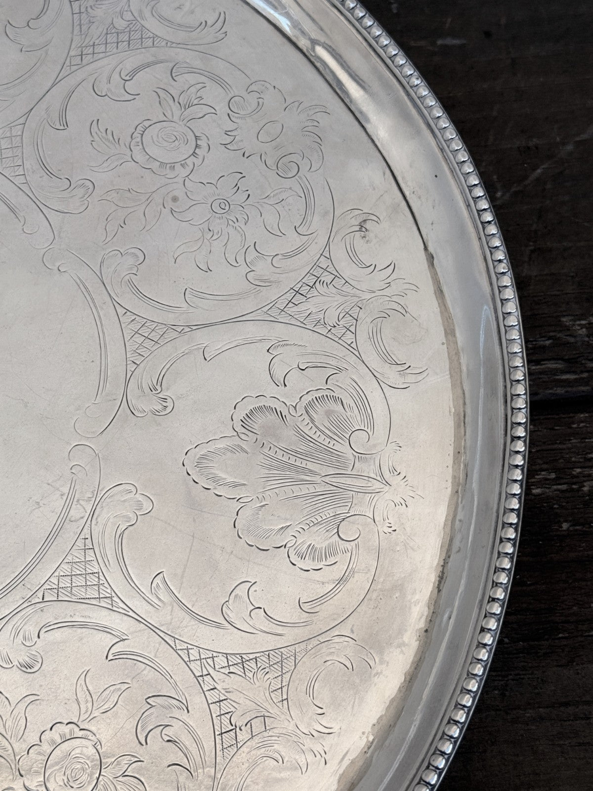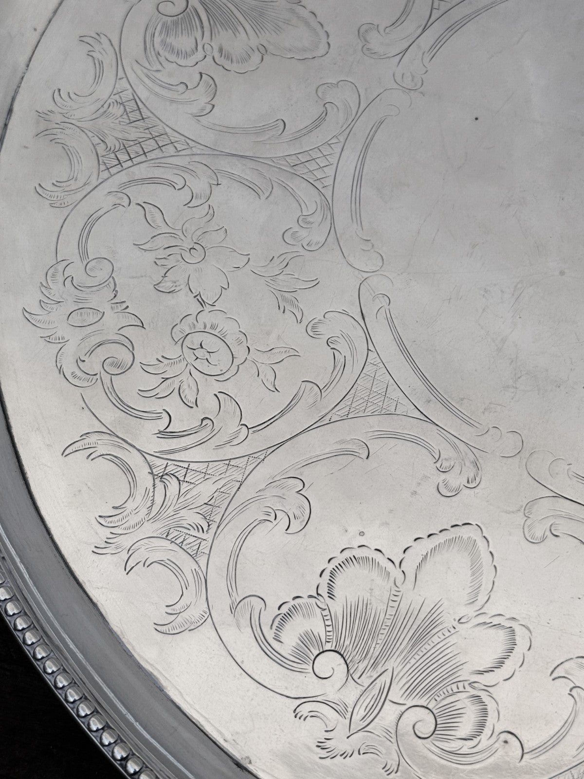This is 822g worth of Sterling Silver. This has London Hallmarks for 1786 and "HB" for Hester Bateman. This is a circular claw footed salver, not oval. The pictures were shot a a slight angle to show the feet.