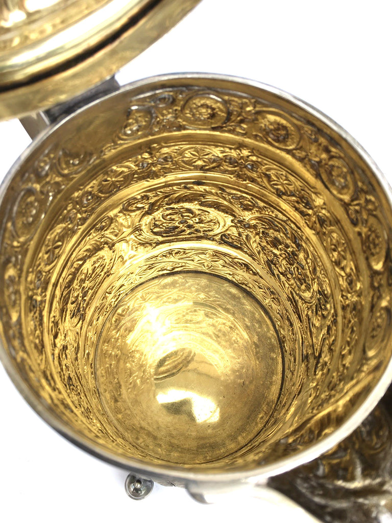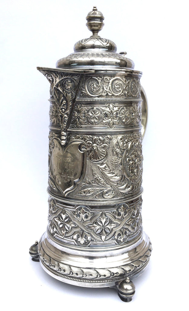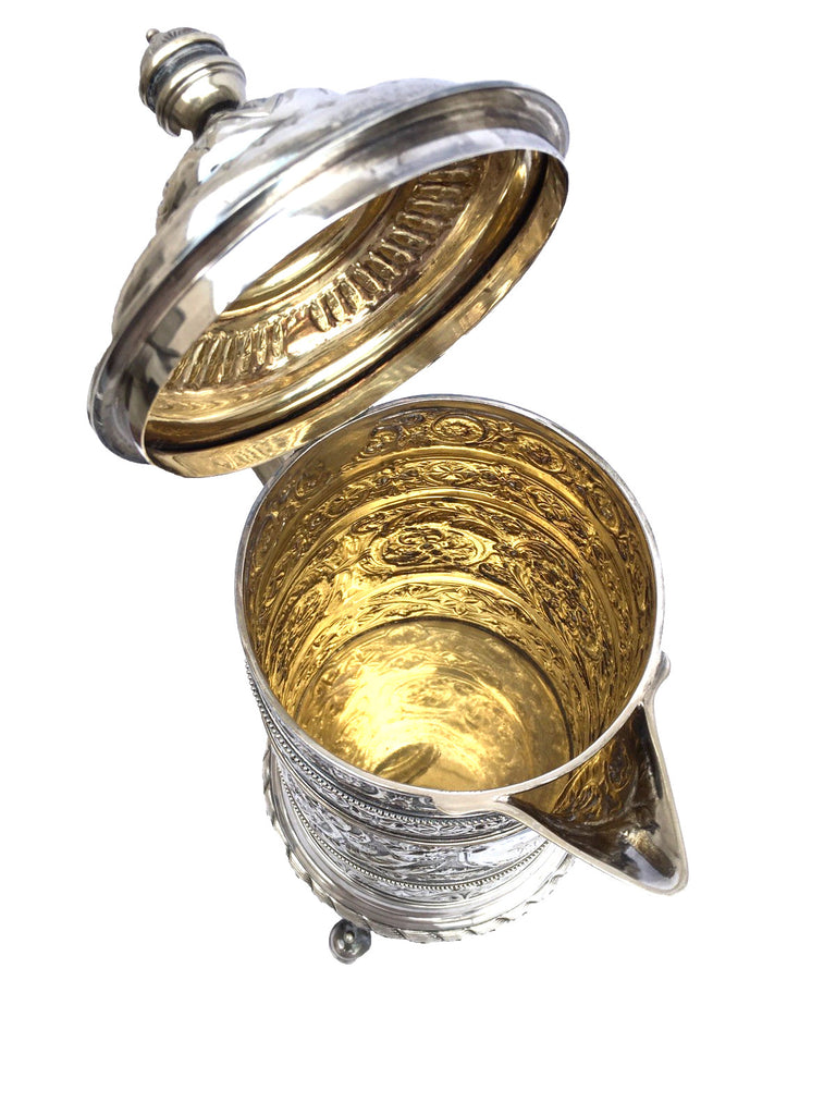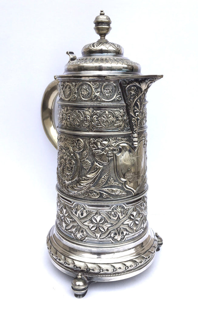 Condition: this silver plated tankard pitcher is in beautiful original condition with light patina on the outside, the gilt interior looks excellent. monogrammed FML, some plate loss indicative of age use and polishing