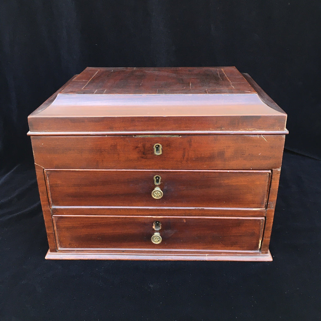 19th c. English Mahogany Jewelry Box, 2 Drawers, old velvet lining w/ Key