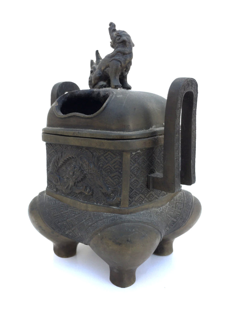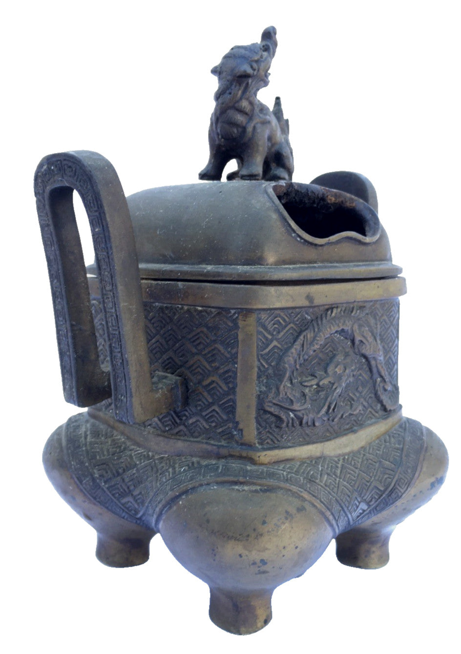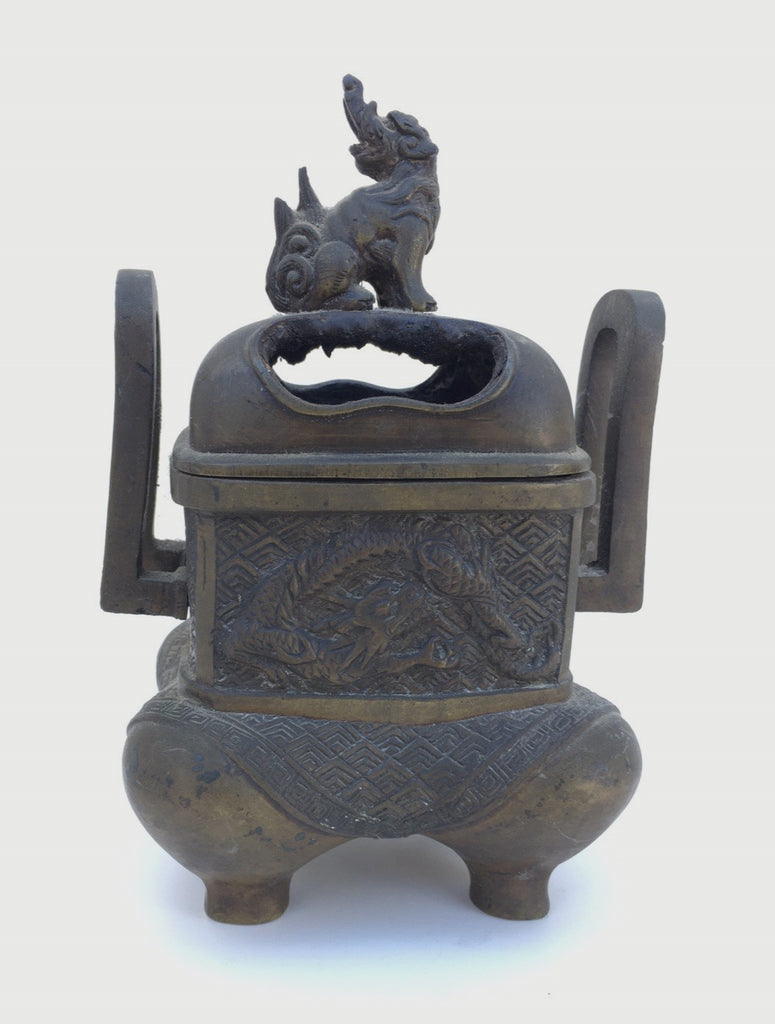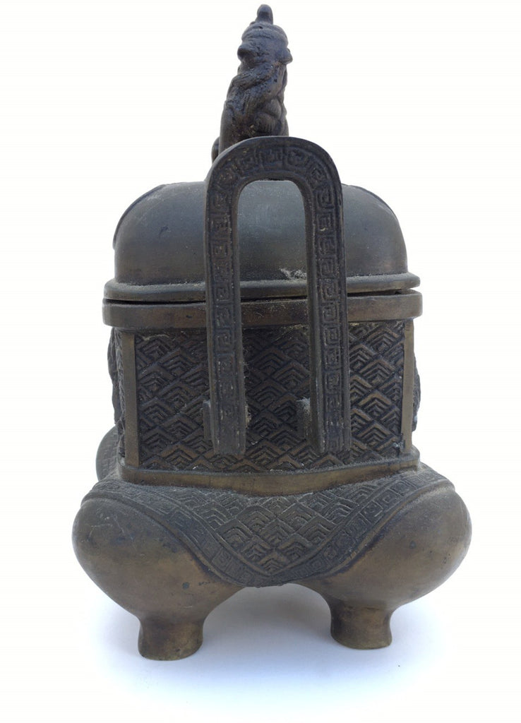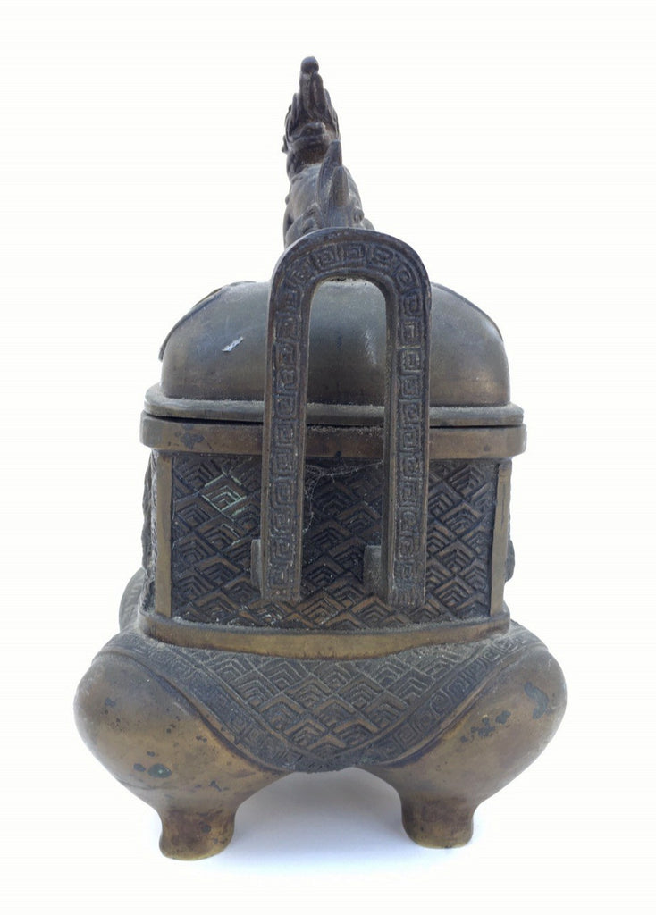 The lid has an oval shape opening and a mythical animal sits on he top of the lid.
