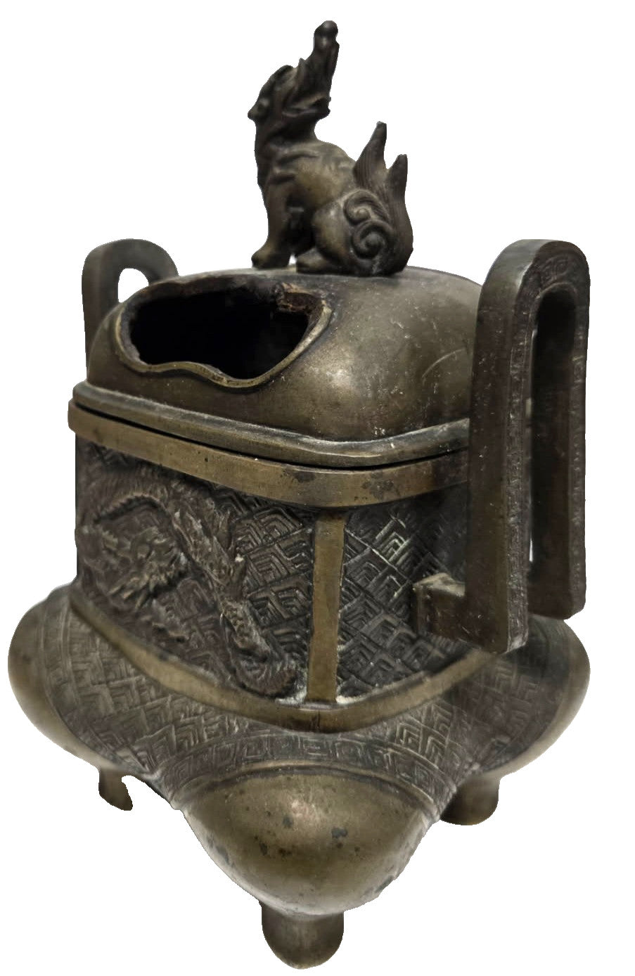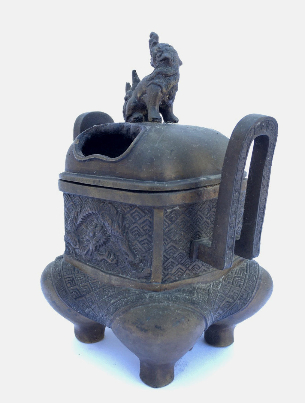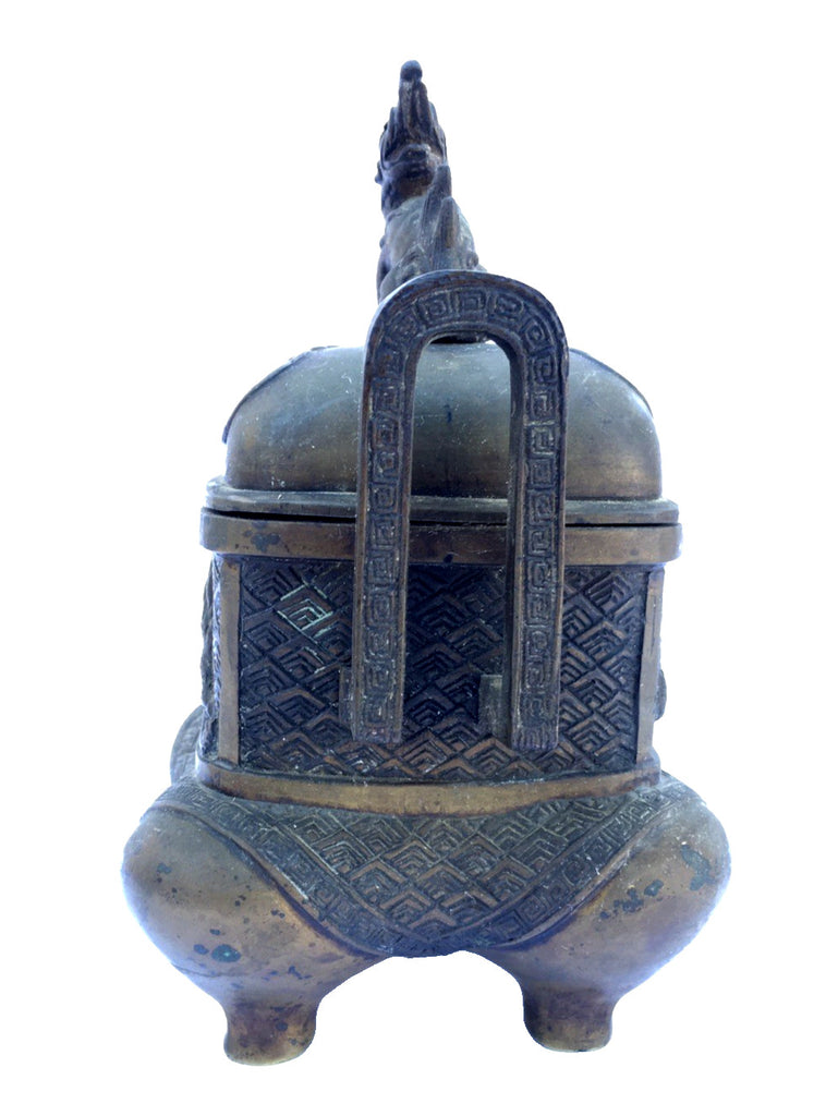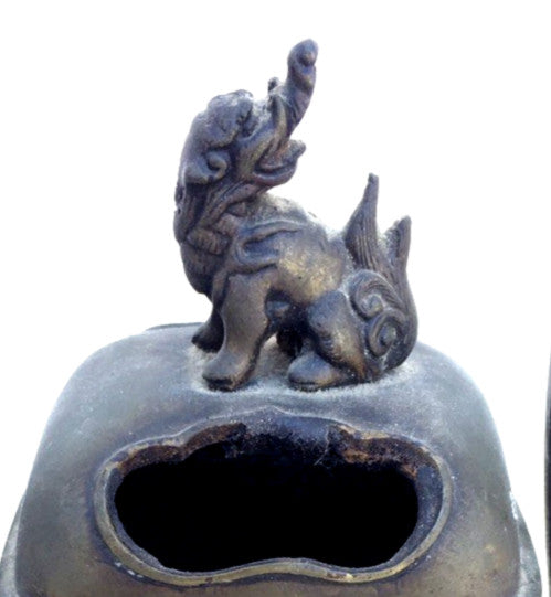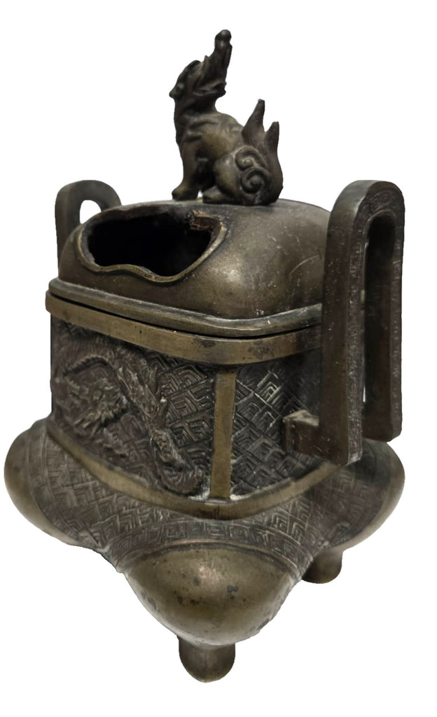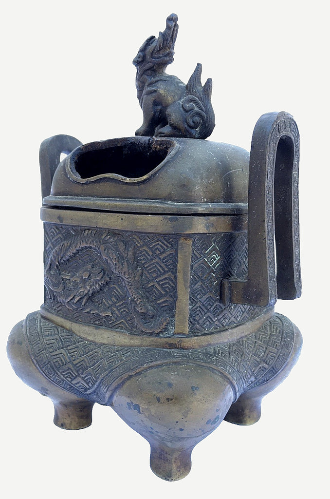 The lid has an oval shape opening and a mythical animal sits on he top of the lid.