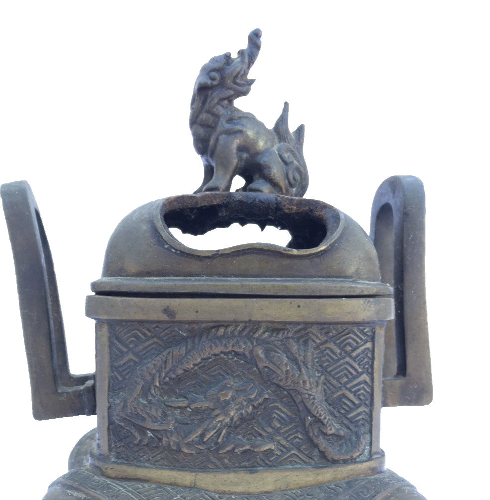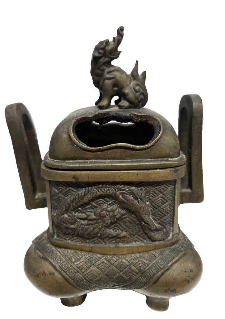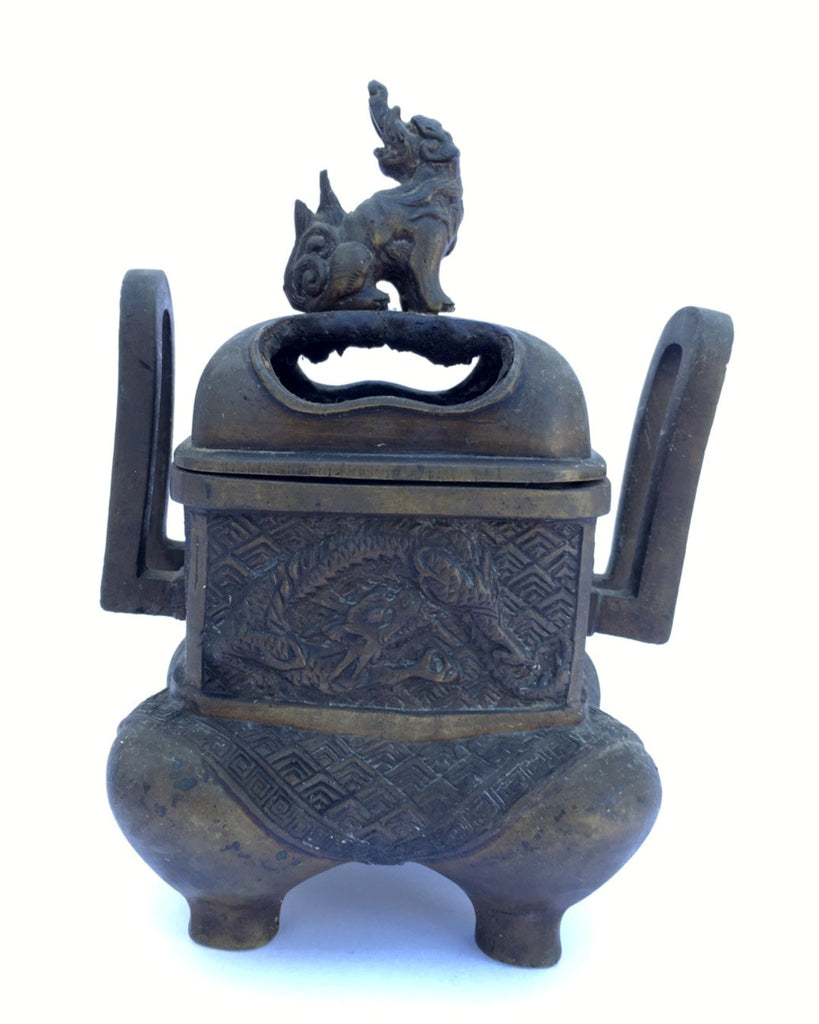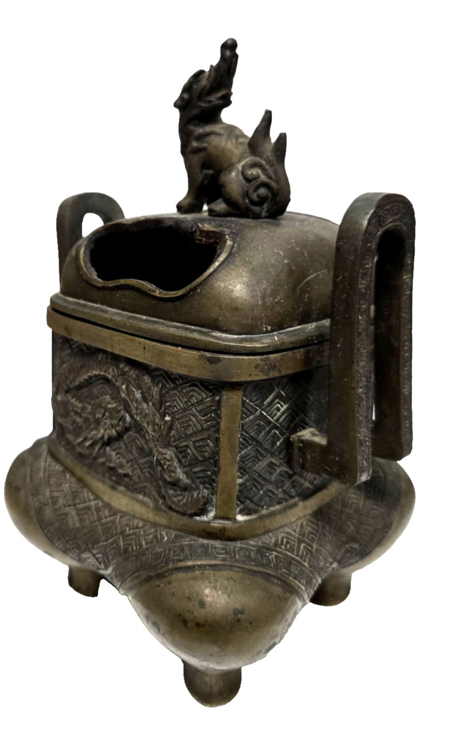 The lid has an oval shape opening and a mythical animal sits on he top of the lid.