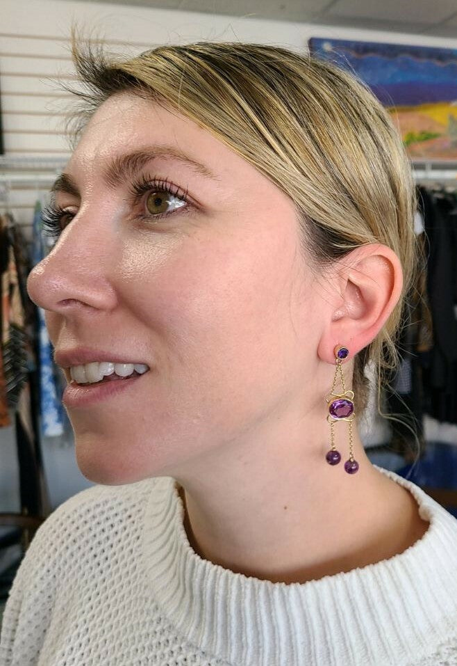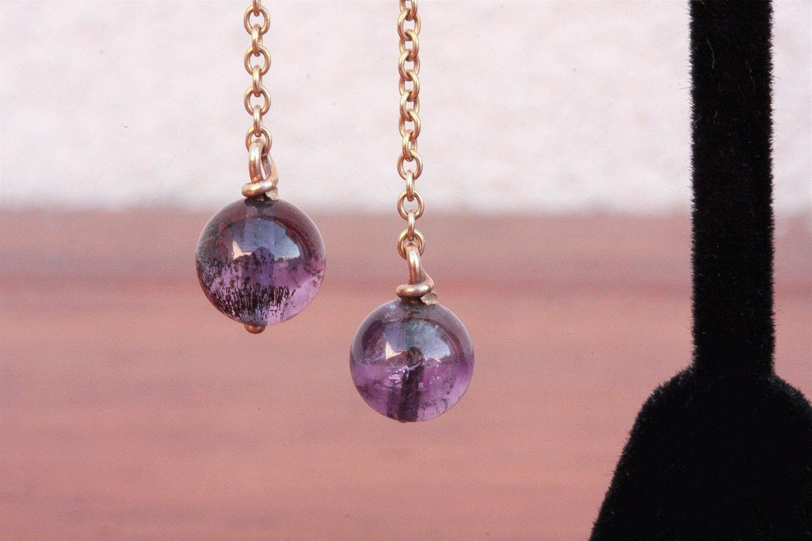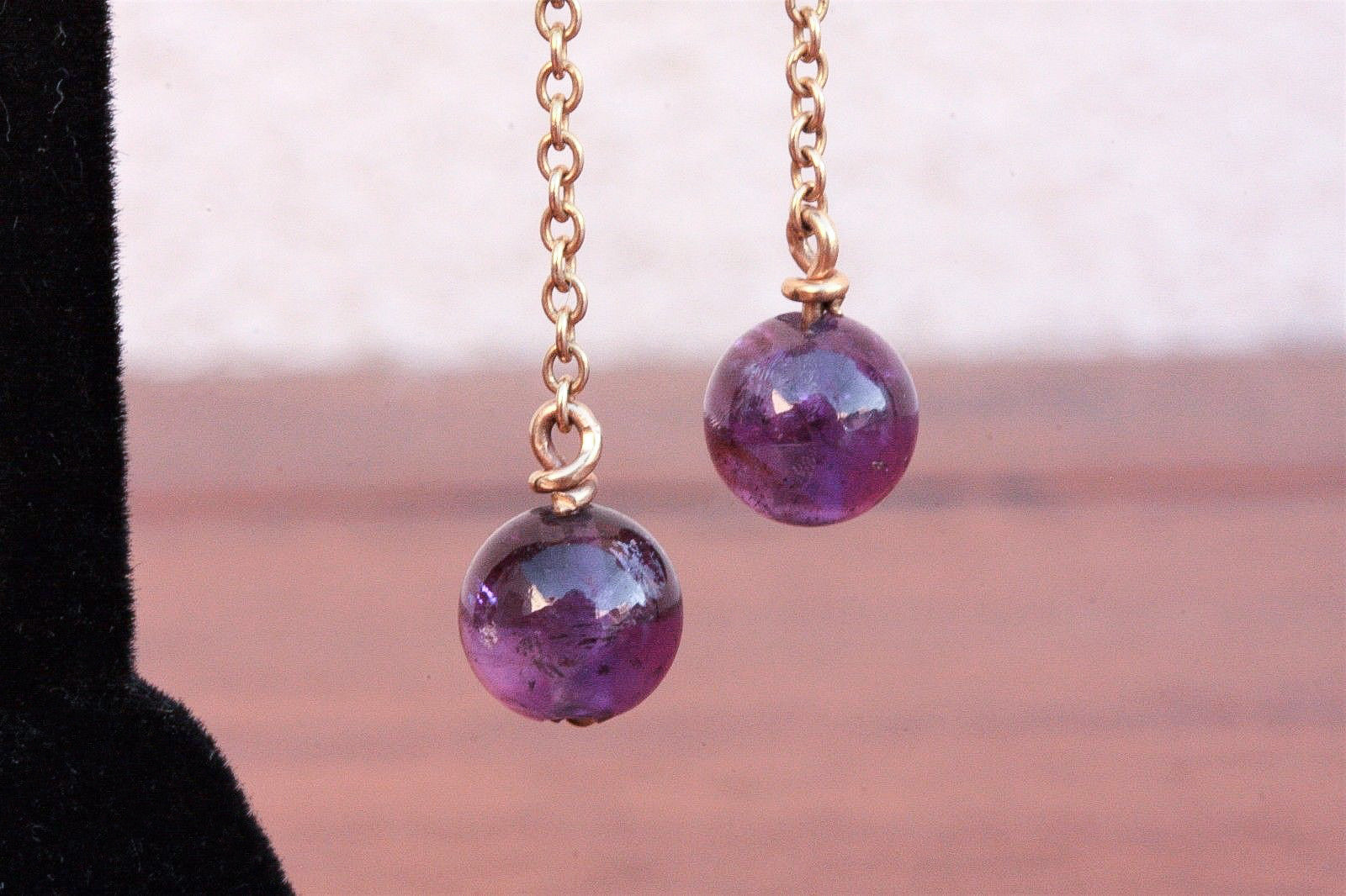 This pair of earrings feautures a 3 part design. Two Amethyst Spheres attached by delicate gold chain dangle at different lengths below a cut oval amethyst, set in a gold frame, linked by more delicate gold chain to an amethyst studded post.