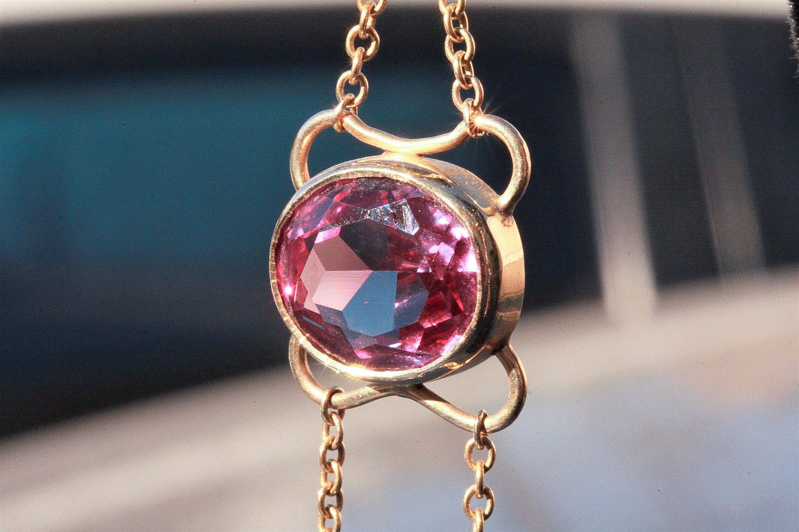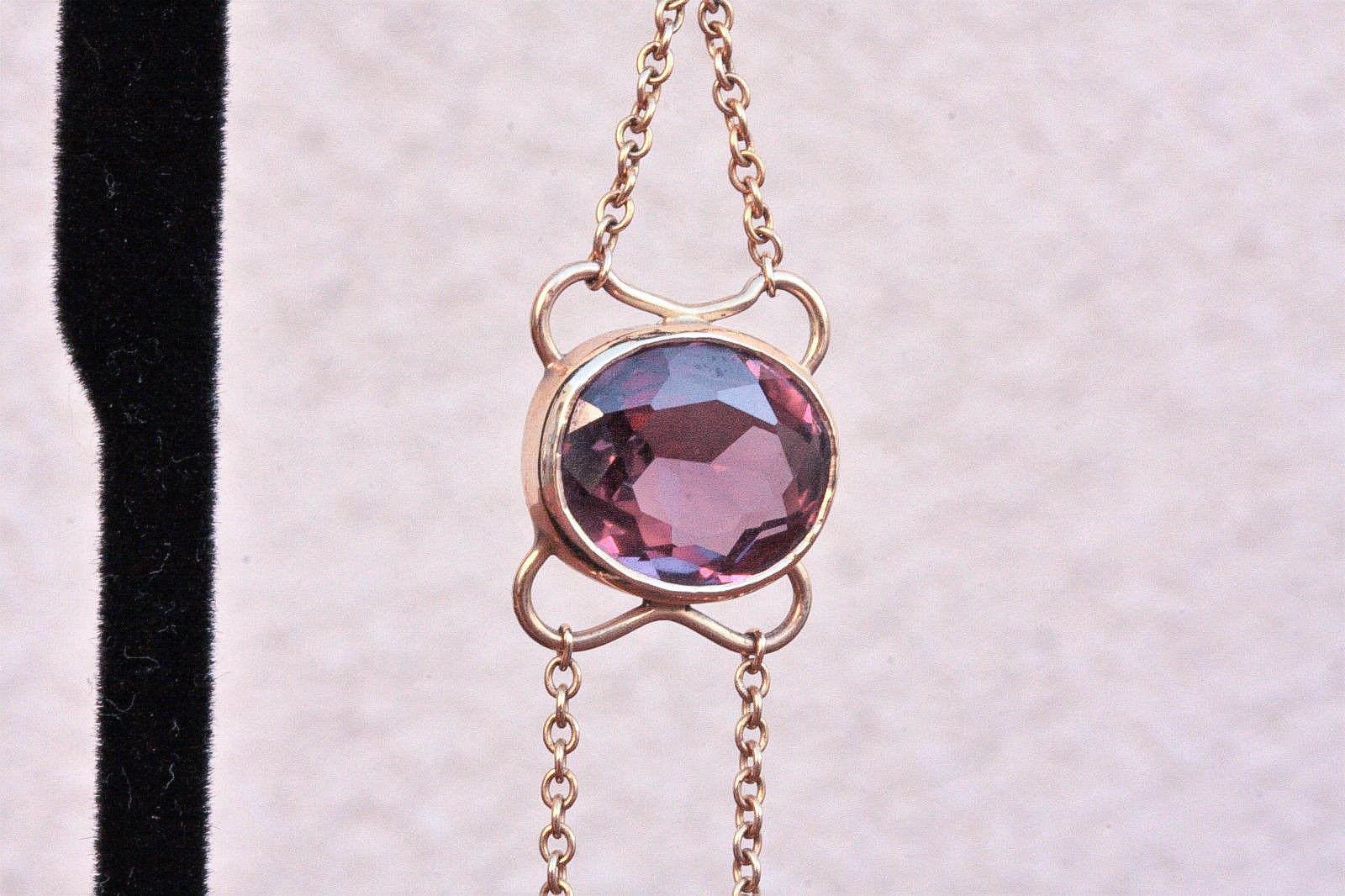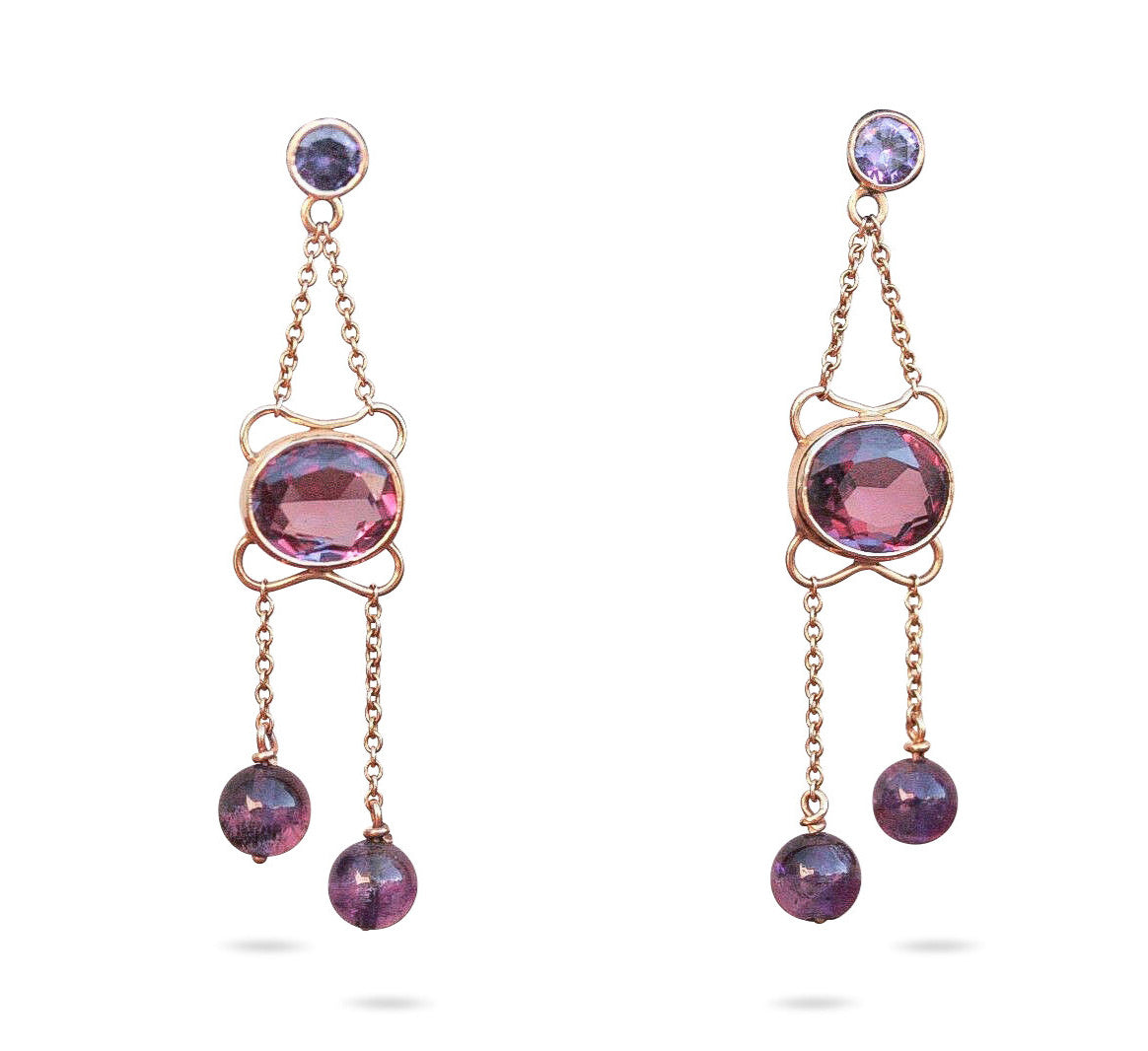 This pair of earrings feautures a 3 part design. Two Amethyst Spheres attached by delicate gold chain dangle at different lengths below a cut oval amethyst, set in a gold frame, linked by more delicate gold chain to an amethyst studded post.