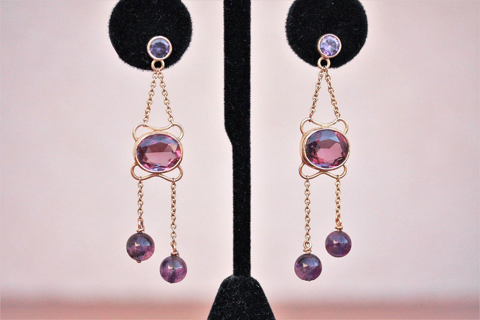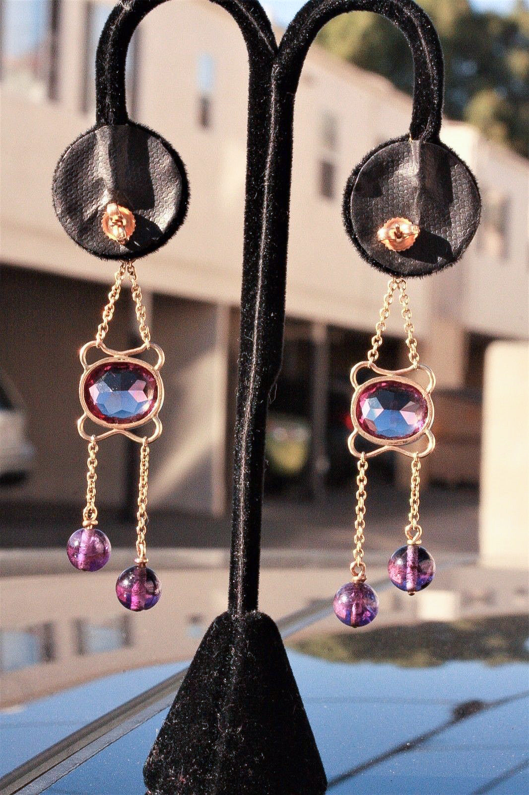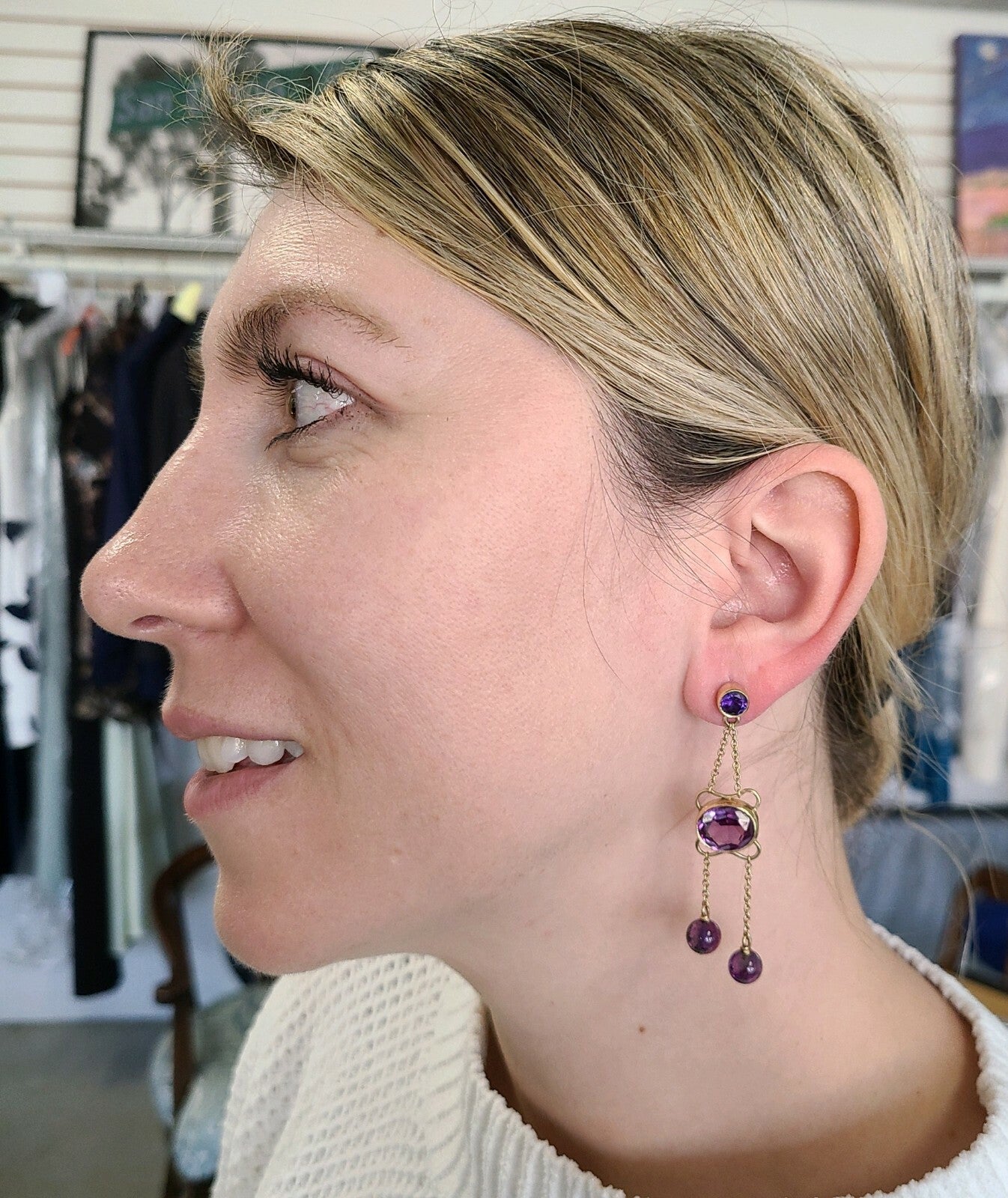 1960's Pair of 14K Gold & Amethyst Drop Earrings, Pierced, Nice