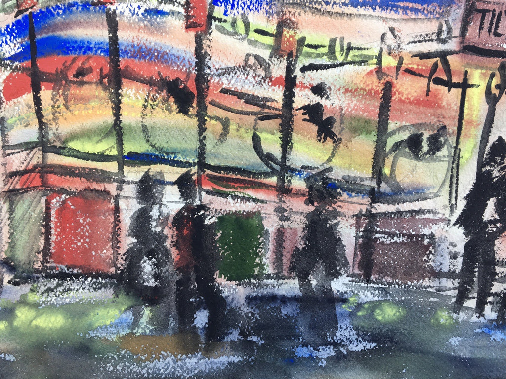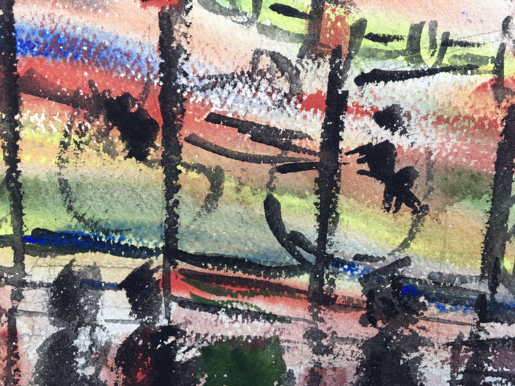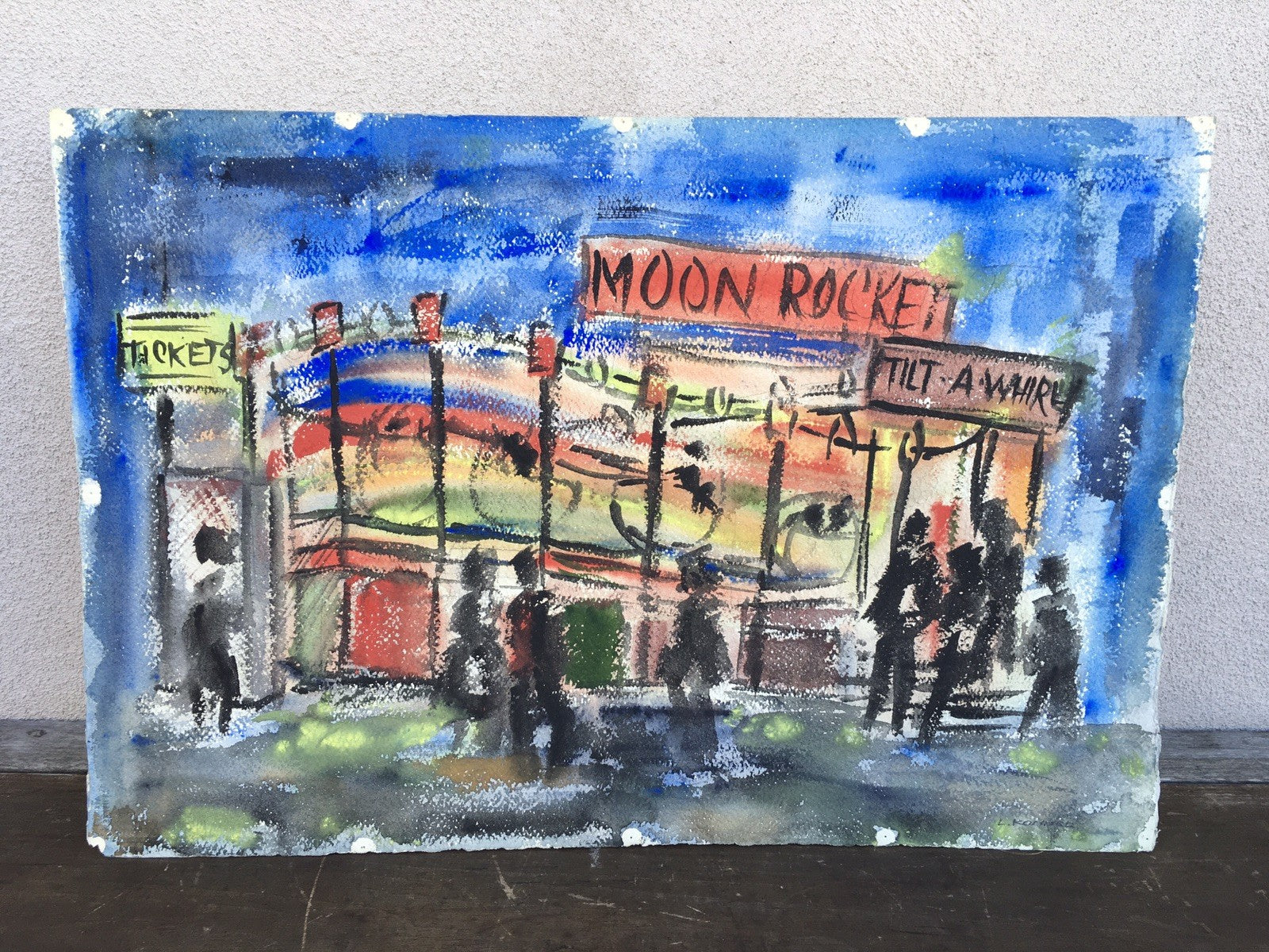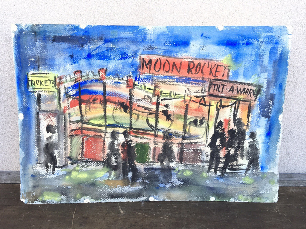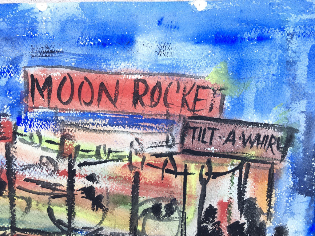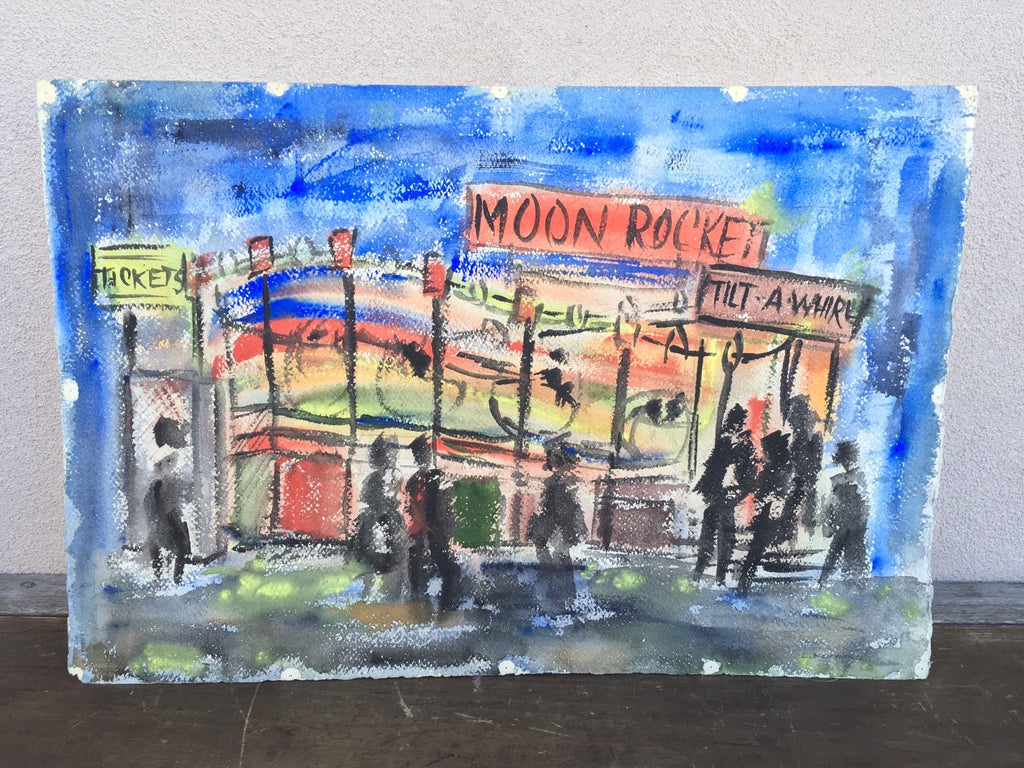 We are offering a mid 20th century space race era watercolor painting of the moon rocket tilt a whirl
